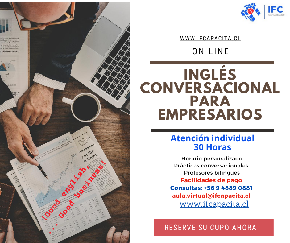 Curso de inglés de conversación para empresarios. Lecturas específicas y conversaciones sobre el material leído con el tutor. Este curso es diseñado de acuerdo con las necesidades de los participantes, se trabaja en grupos o individual.